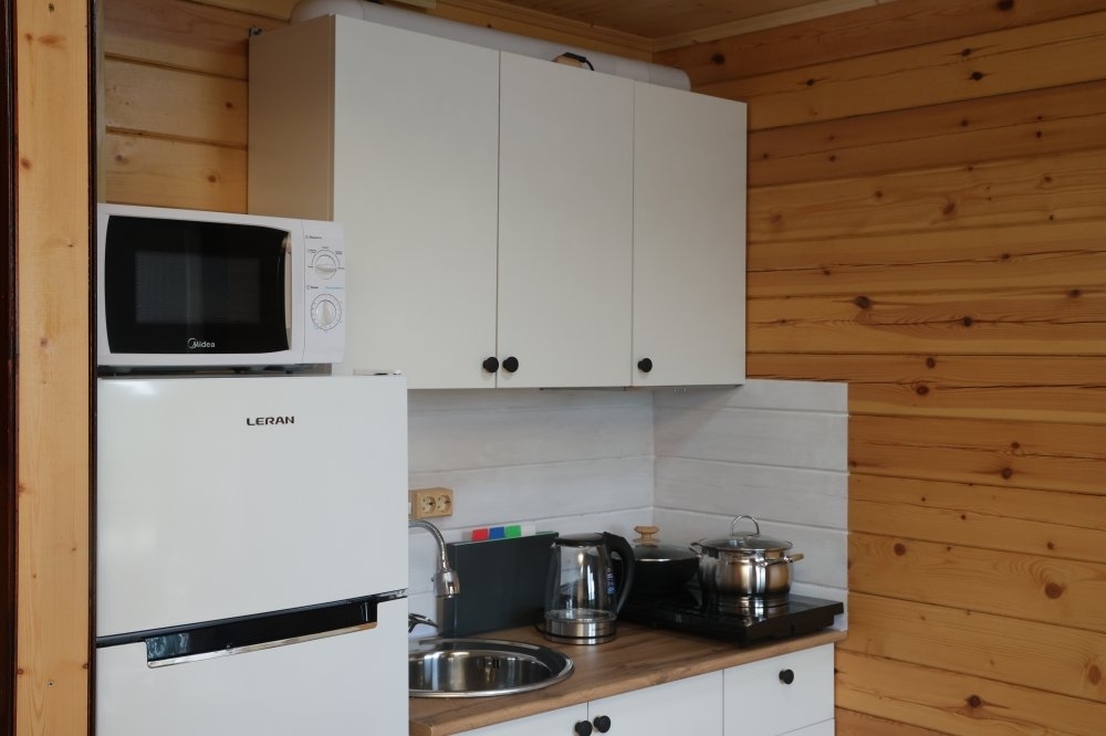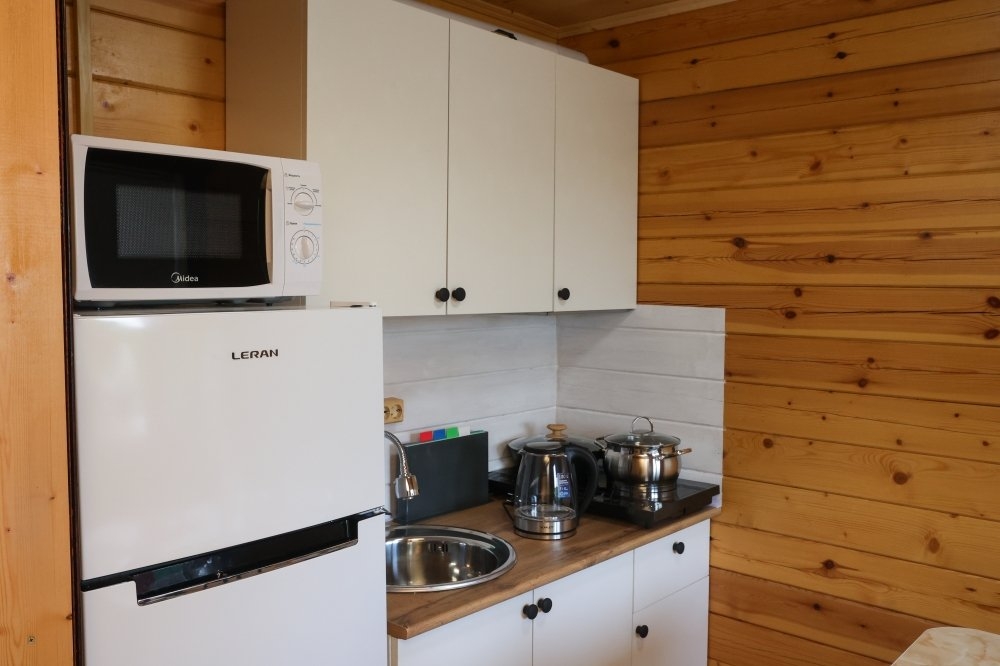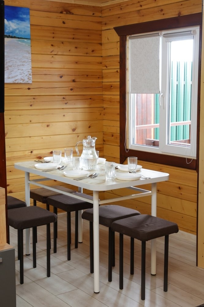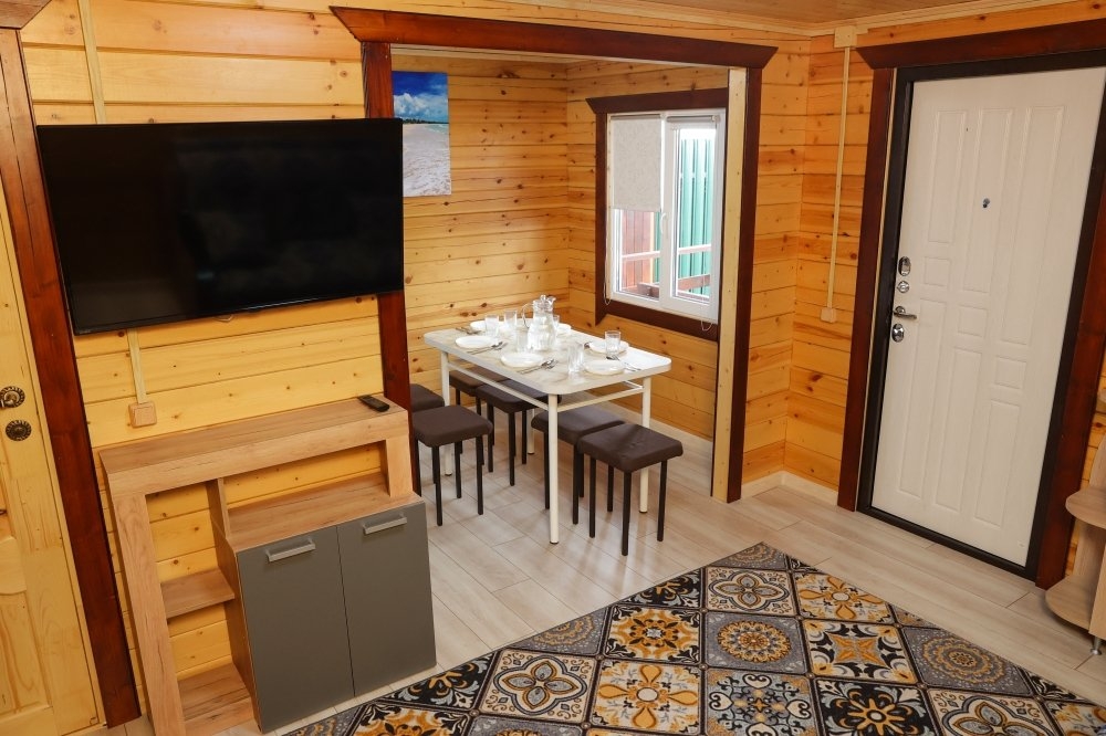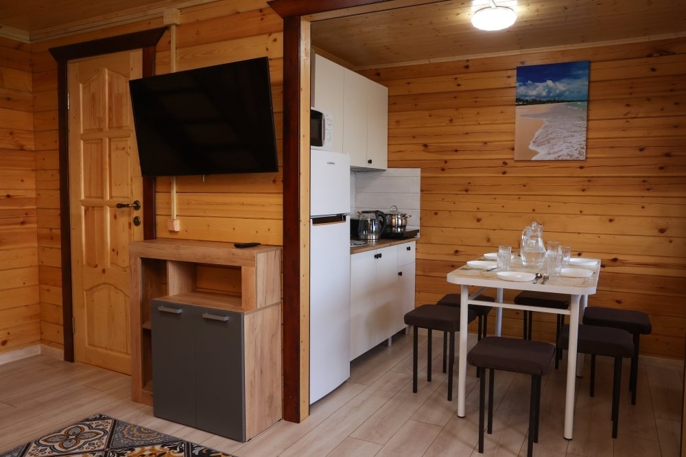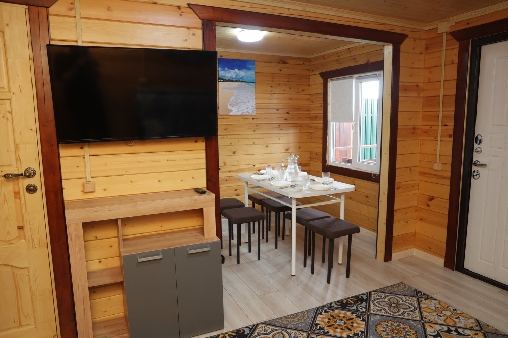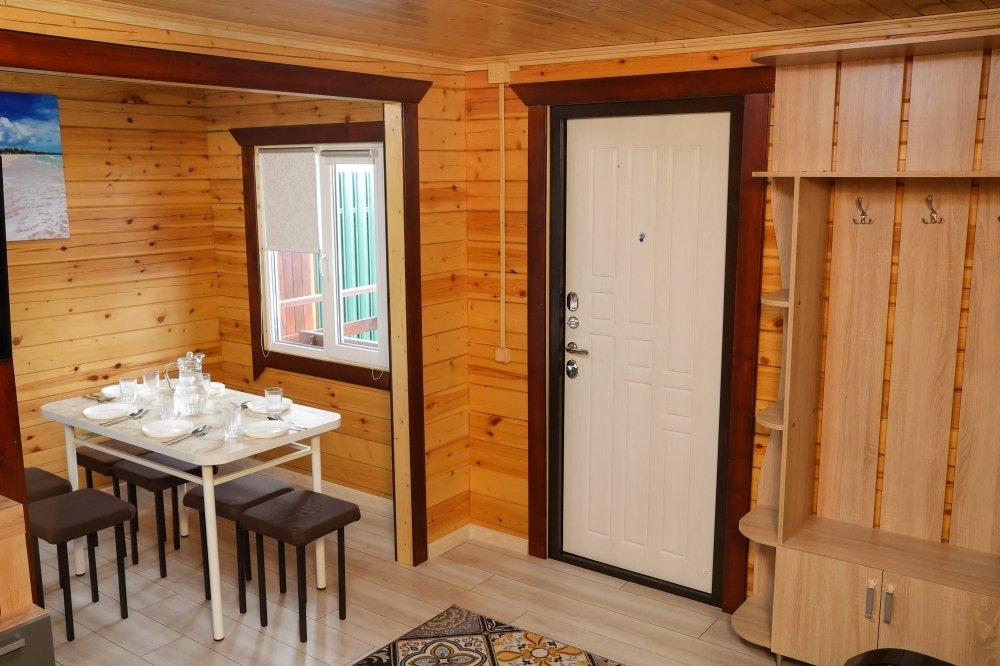 Семейные гостевые коттеджи из сибирской сосны оформлены в современном стиле с элементами минимализма, что создаёт атмосферу уюта и спокойствия. Домики рассчитаны на проживание шести человек, идеально подходят для семейного отдыха. Внутри уютно и комфортно, столовые приборы и имеется всё необходимое для комфортного пребывания. Бесплатная охраняемая стоянка.