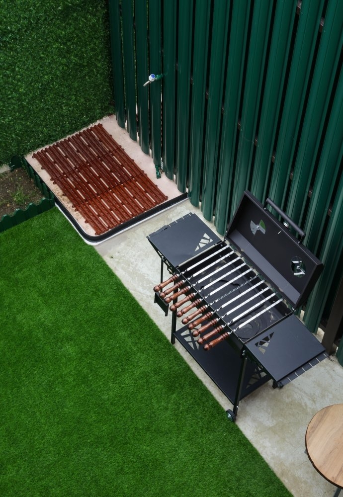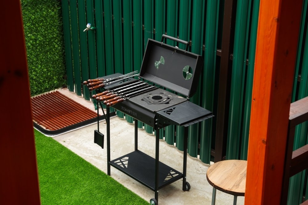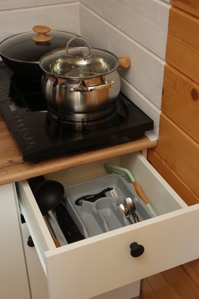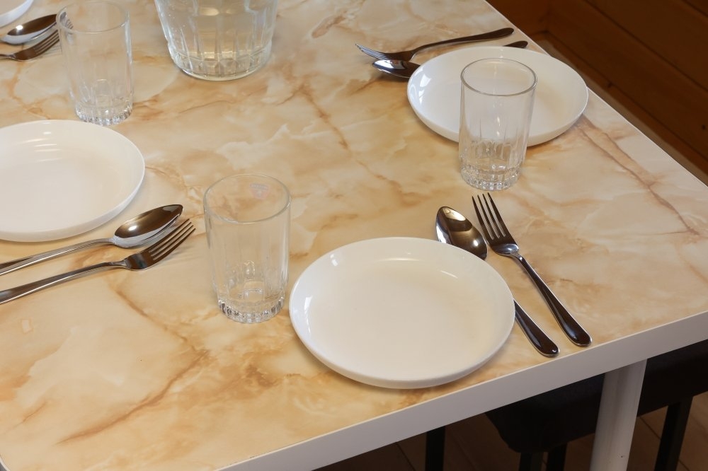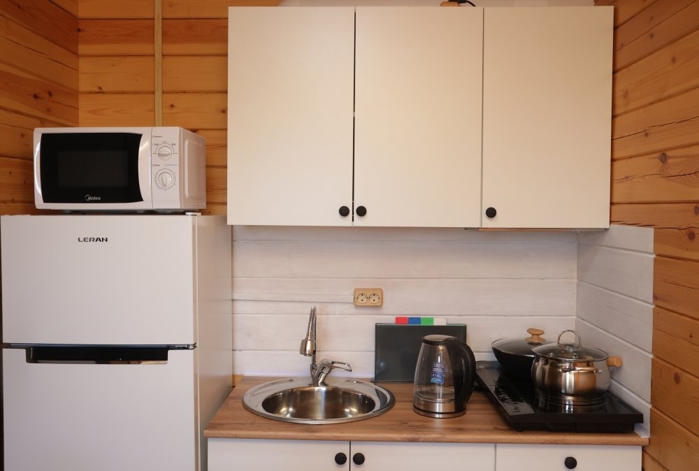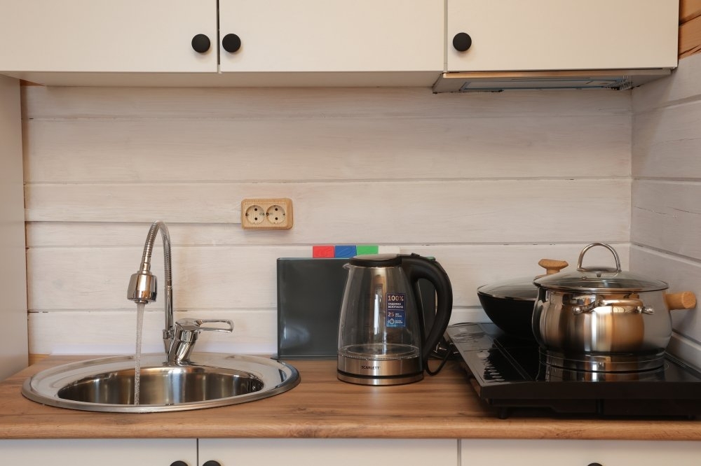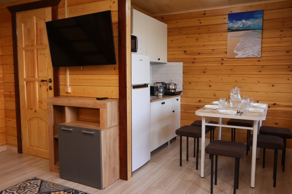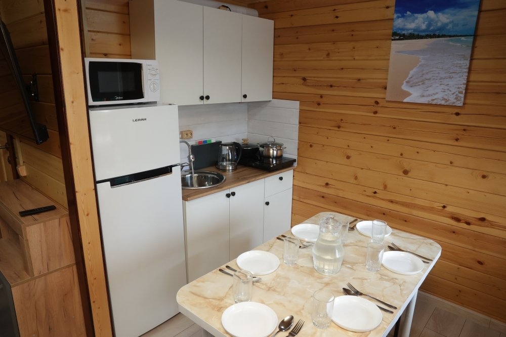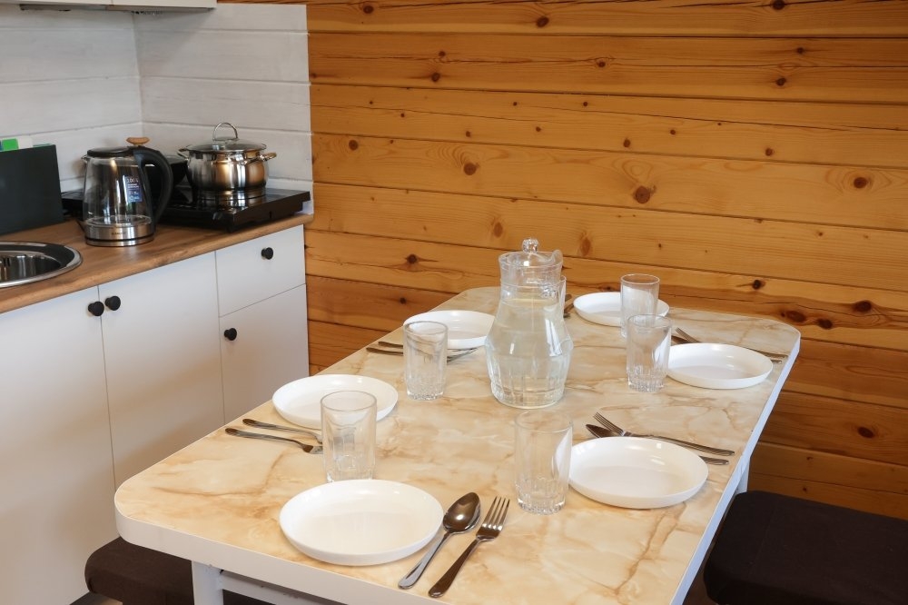 - мини-кухня, чайник, набор посуды, обеденный стол, столовые приборы